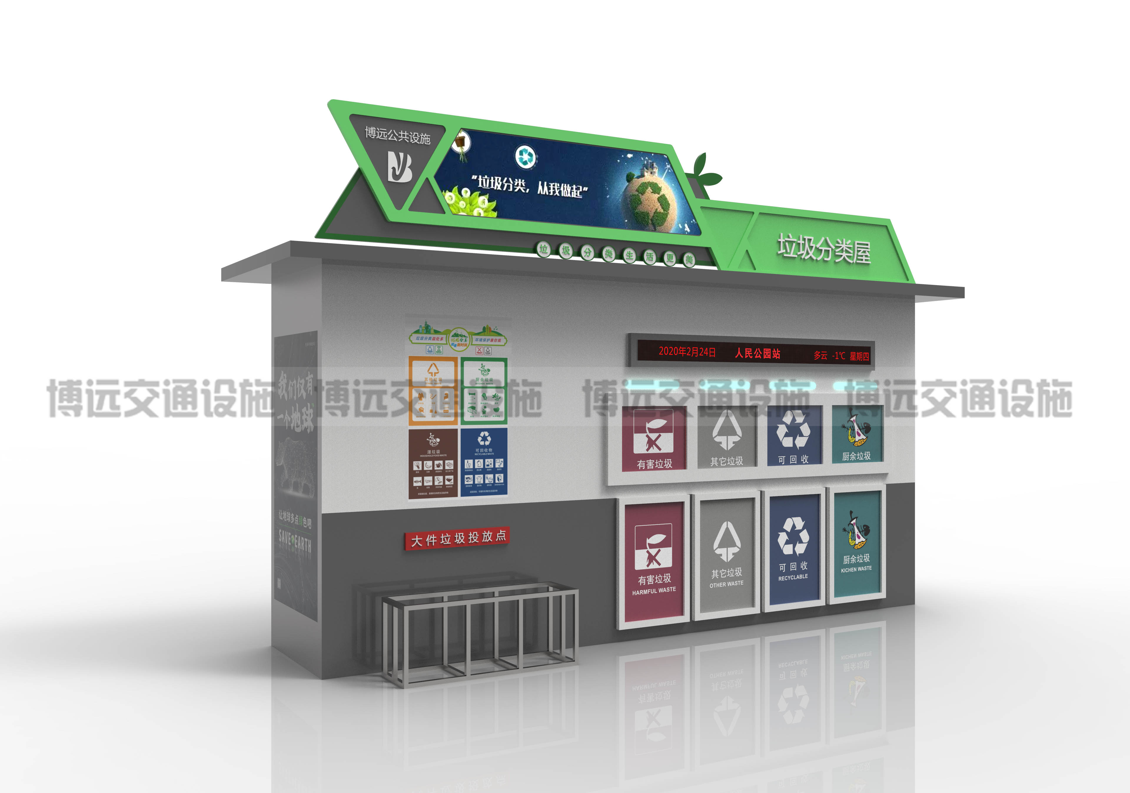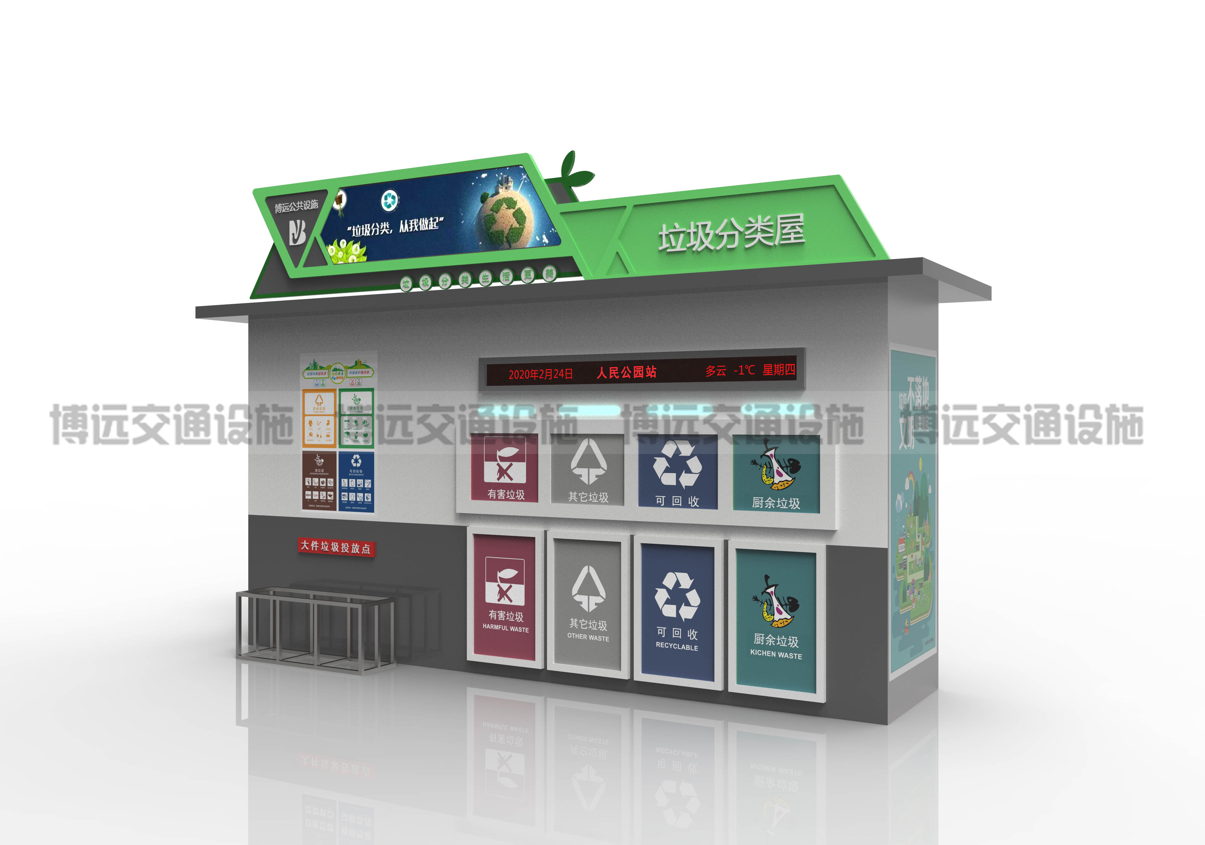 垃圾分为可回收、不可回收、有害及其它垃圾。共分为四类。再生资源是指适合回收利用的垃圾,包含纸、塑料、玻璃、布、瓶、罐等,并搜集于蓝色垃圾箱内。有害垃圾是指含有有害物质,需求特别安全处理的废物,包含电池、灯具、化学药品等,都在红色垃圾亭里,其他垃圾则是指未分类的垃圾,搜集在灰色垃圾桶里。下面博远交通设施就智能垃圾分类房有哪些长处来聊一聊。