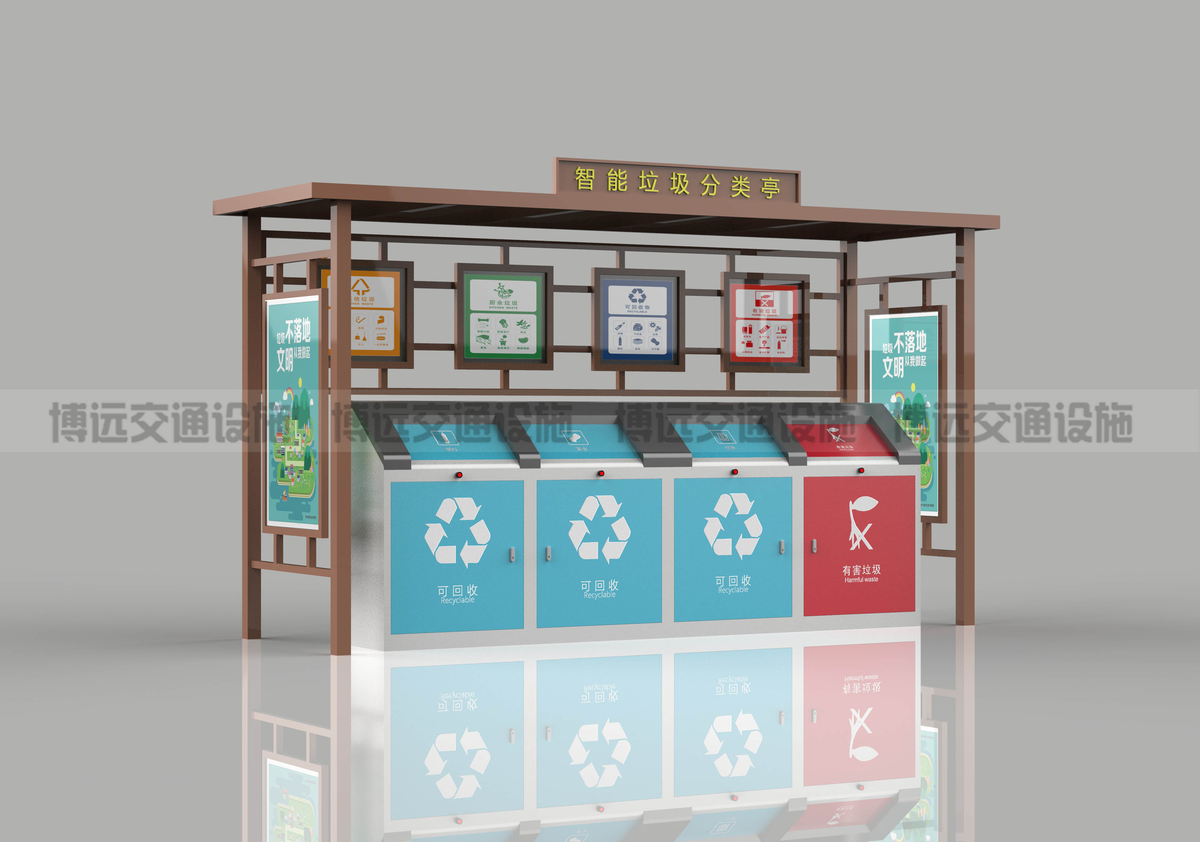 生活垃圾分类收集是城市生活垃圾处理的主流趋势,也是现代城市文明进步的标志之一。有利于提高垃圾清运效率,有利于再生资源的循环利用,减少环境污染,减轻环卫工人日常清扫的压力。垃圾分类亭分为基础设施、公益宣传栏、立柱、顶棚等。亭内设置可回收物、有害垃圾、厨余垃圾等垃圾桶。垃圾箱、宣传栏均设有垃圾分类的宣传标语,群众可根据垃圾箱的提示将废弃生活垃圾投放到相应的垃圾箱内。