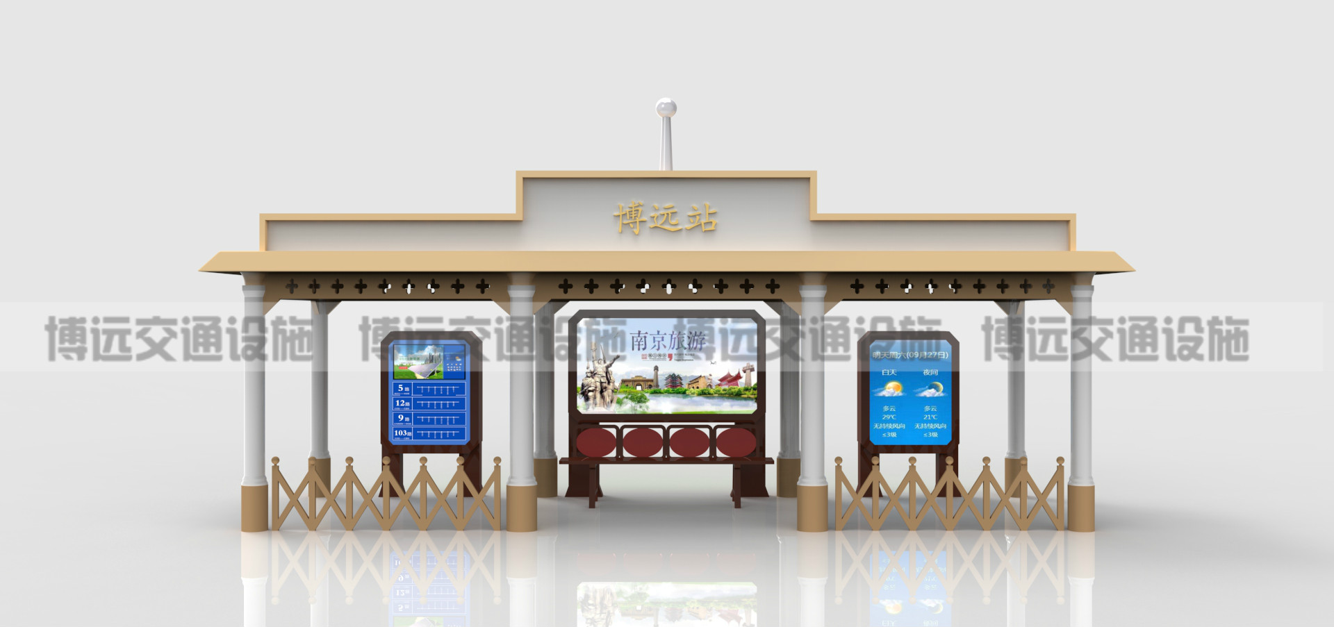 常见的公交候车亭往往是一整套完好的设备,包括候车棚、电子站牌、废物箱等一系列设施,它主要效果就是给候车乘客提供候车的歇息场所。