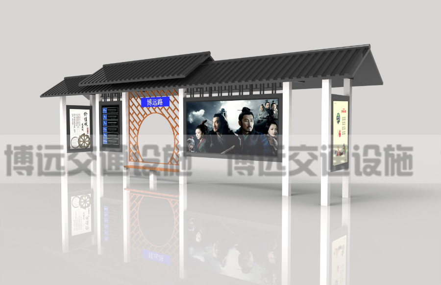 仿古候车亭规划配合城市的整体特点,宣传整个城市的文明前史,大多选用铜色或许深咖色作为色彩主调,顶棚选用仿古瓦。其特点是古典元素与当地文明美妙结合,散发着一种陈旧建筑的特别神韵,放在拥堵繁华的街道边供应市民候车,给人带来惬意舒适的感觉。