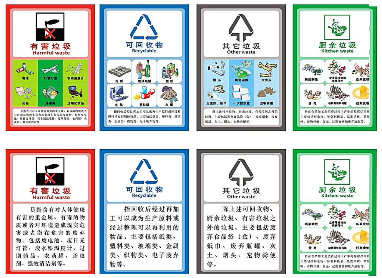 可收回物包含废纸、塑料、玻璃、金属、布料,不行收回物包含食品袋、保鲜袋、抛弃纸巾、抛弃瓶罐,有害废物包含废电池、废油漆桶、废旧灯管、过期药品。了解了这些分类,您知道该怎样投进了吧。