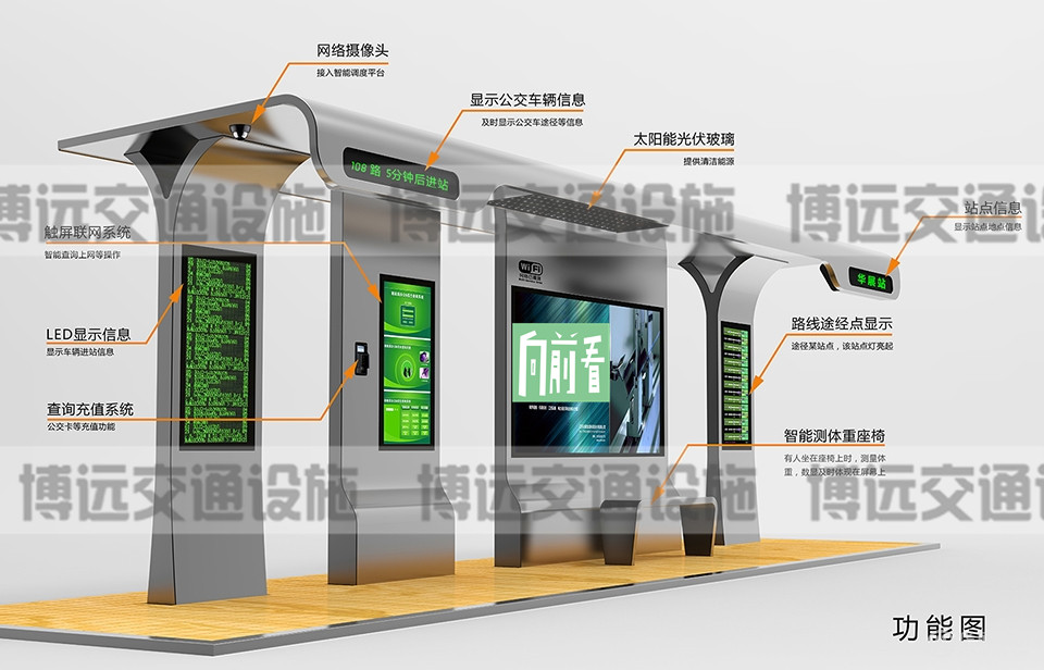 人们在候车过程中可通过电子站牌的LED屏提前知道所要乘坐的公交车运营位置,大概还需要几站、多远距离到达本站。现代城市智能公交候车亭是运用公交车车载GPS全球定位系统,通过公交信息管理中心服务器组及无线数据传输网络,接收和发布公交车运行信息。